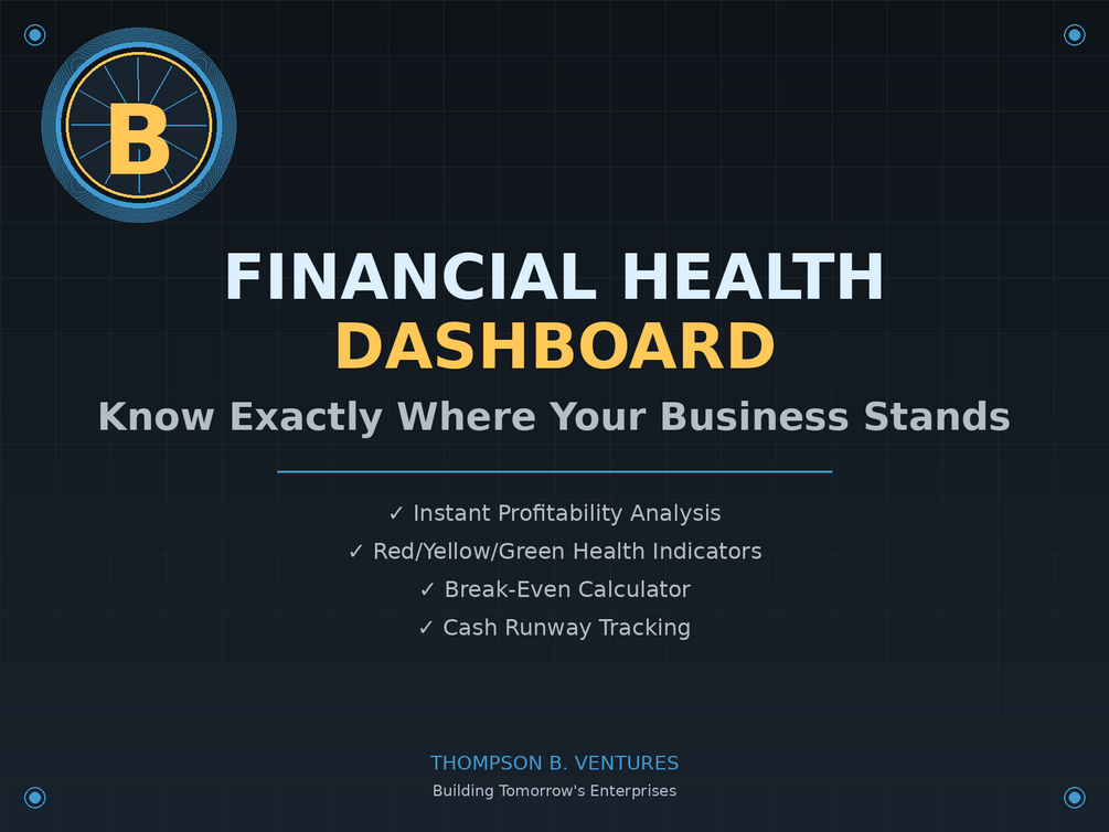 Excel template that instantly shows your real profitability, health status indicators (🟢🟡🔴), and cash runway. Just enter your monthly numbers - everything calculates automatically. Perfect for retail, restaurant, and service business owners managing $100K-$5M in revenue. ✓ Instant Download ✓ Lifetime Access ✓ Works with Excel, Google Sheets, LibreOffice